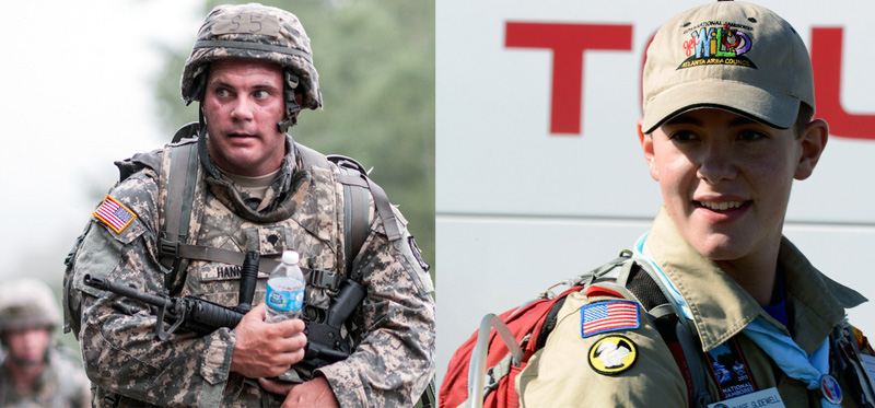 Solider photo from Flickr: Some rights reserved by DVIDSHUB; BSA photos copyright Boy Scouts of America: First photo: Eagle Scout Chase Glidewell from Atlanta Georgia Troop A323, Second photo: Life Scout Will Freder from Greenwich, CT Troop B330 upon arrival.