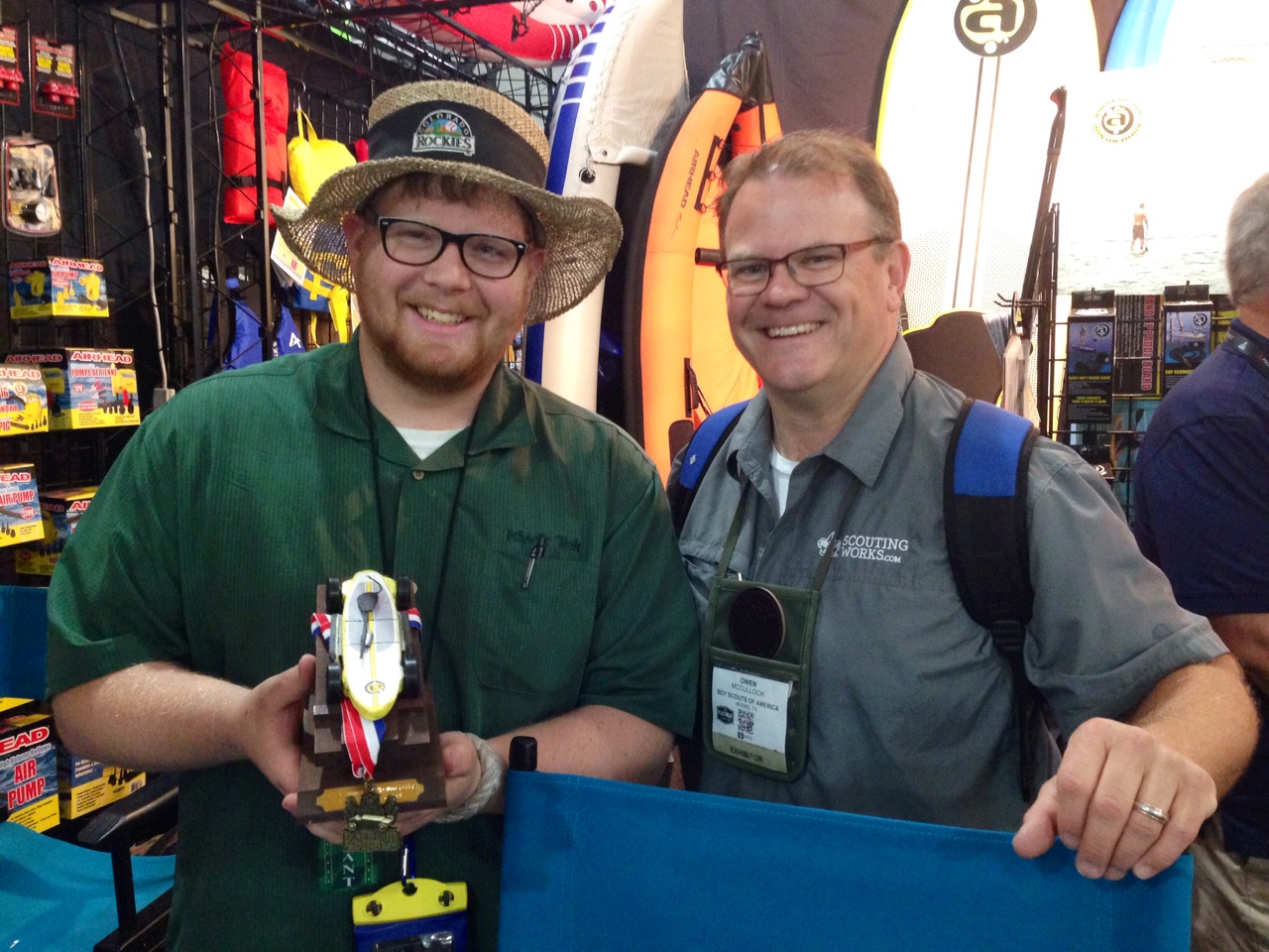 Plus, if you missed it, you voted and Owen McCulloch with the BSA’s Scouting Works team awarded Airhead Tricked Out Car the People’s Choice award after the Outdoor Retailer Pinewood Derby. The company happily accepted their prize — a custom Pinewood Derby car stand — at their booth this morning. Congrats, Airhead!
