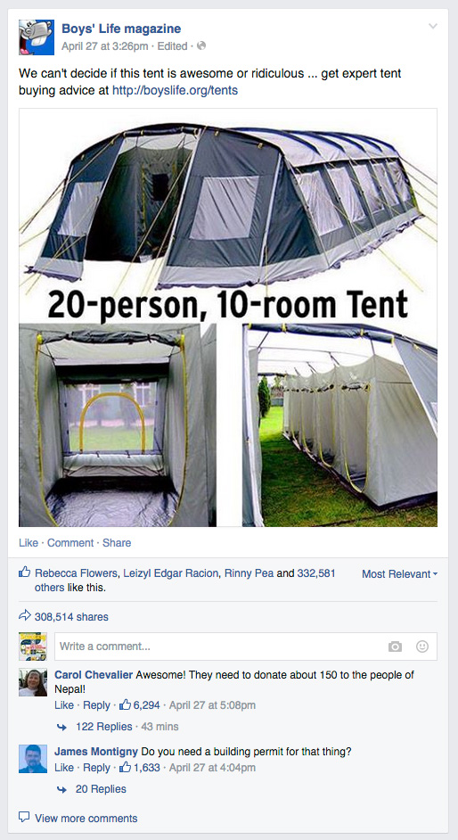A typical Boys’ Life Facebook post gets a few hundred or a few thousand likes. The tent post has, so far, amassed a ridiculous 332,736 likes on the post itself and another 1.25 million likes on shares of the post.