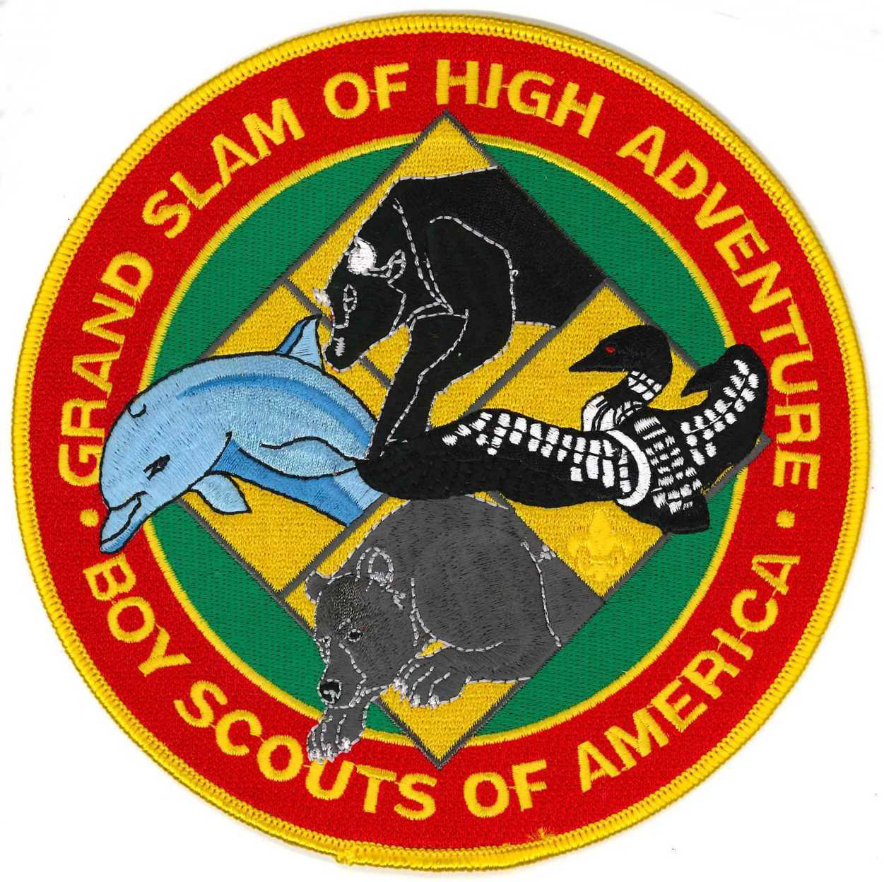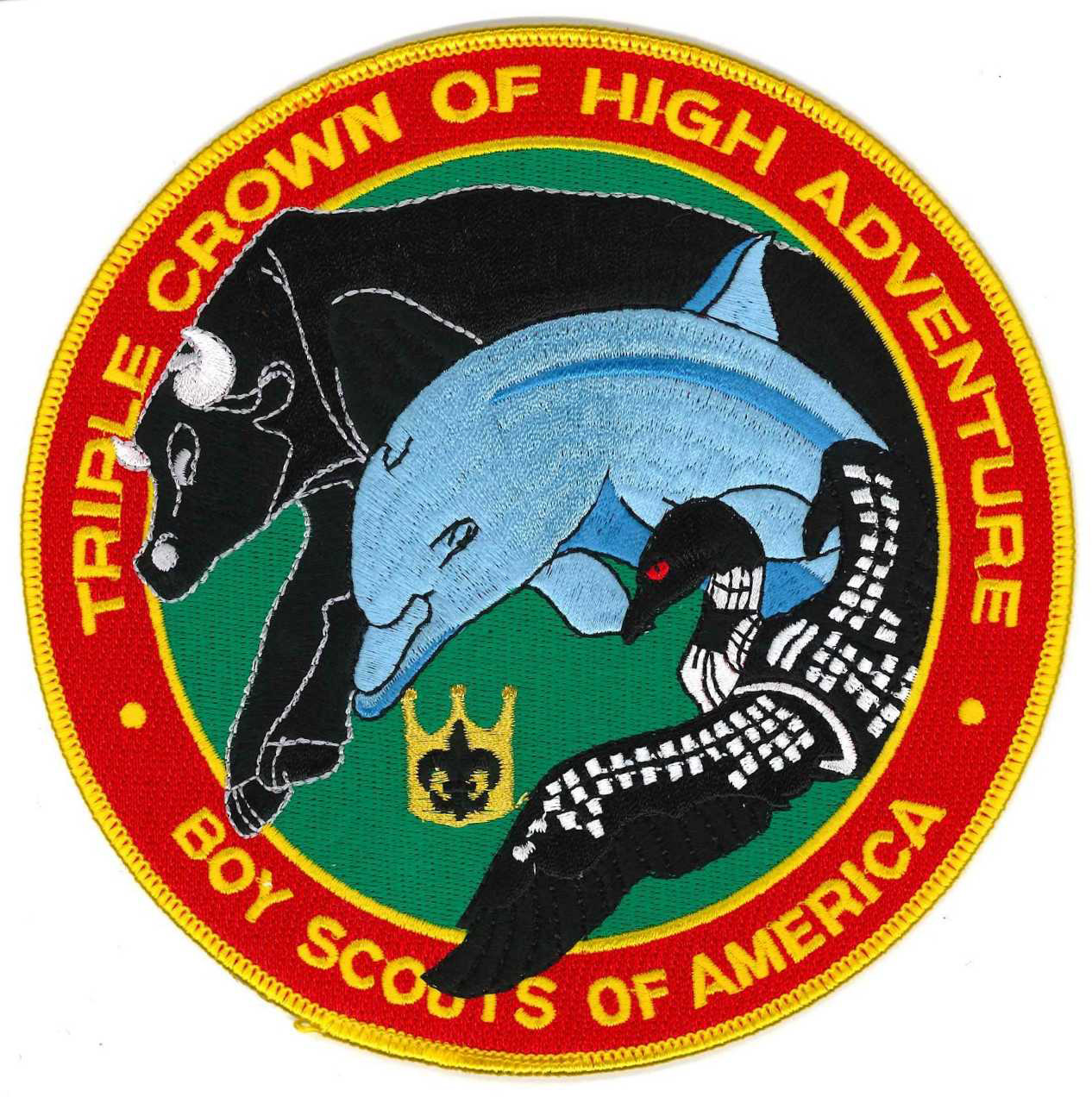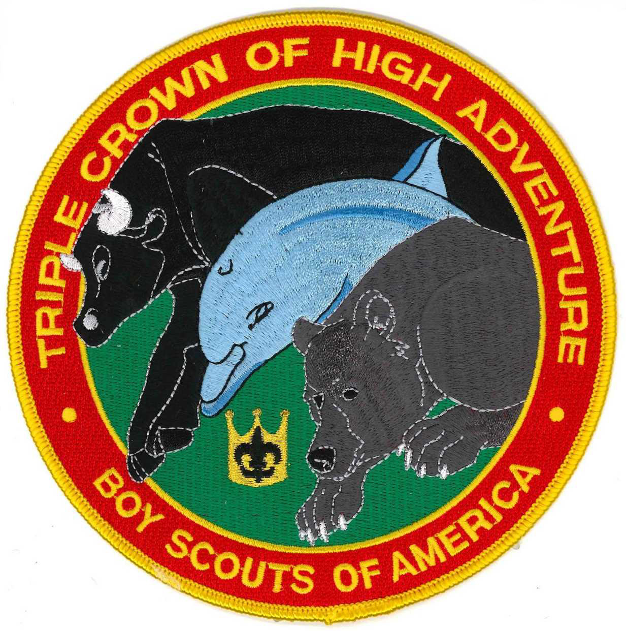 The patch will show a combination of animals that represents the three bases attended: a loon for Northern Tier, a bull for Philmont, a dolphin for Florida Sea Base and a black bear for Paul R. Christen.