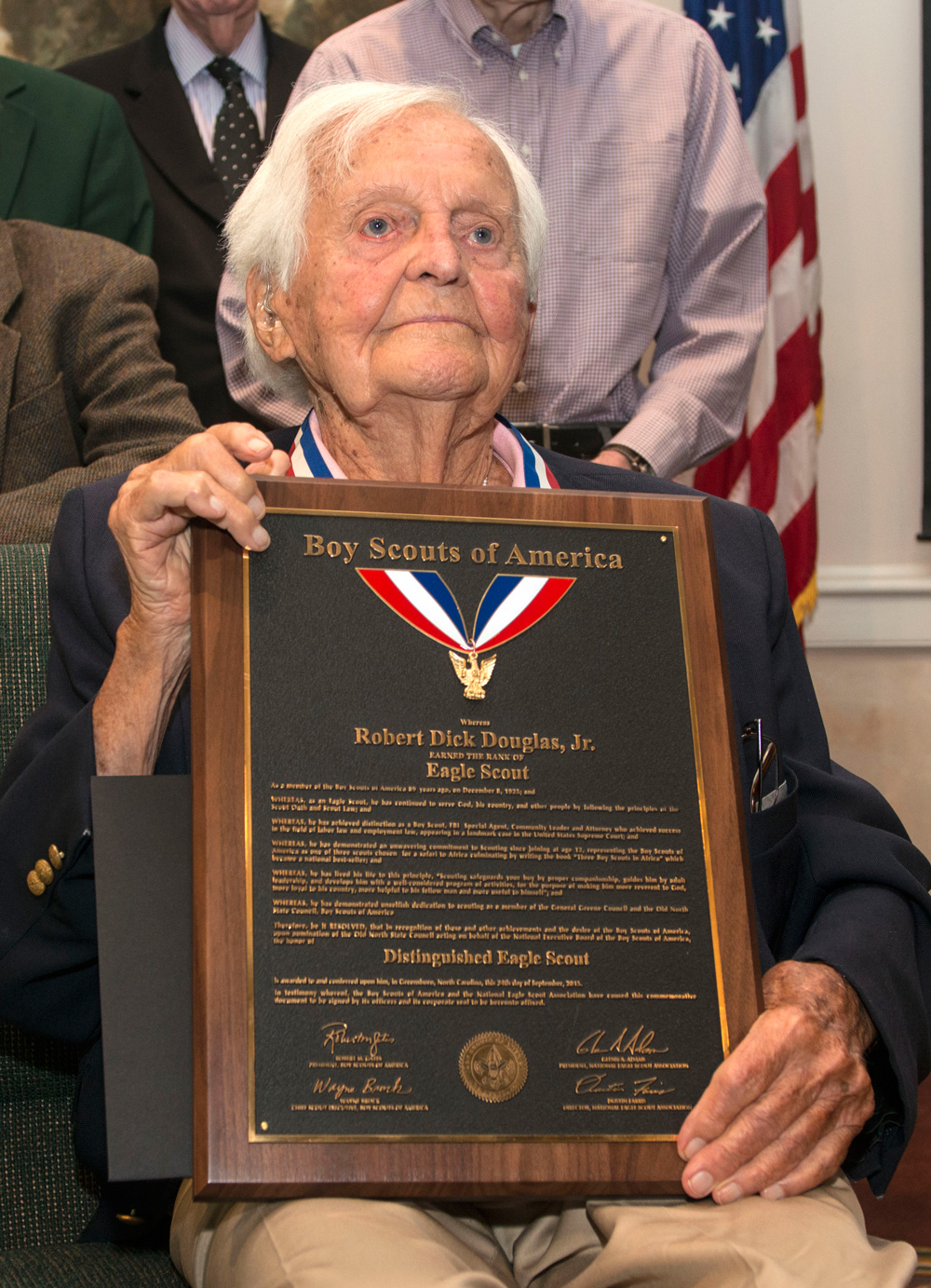 Douglas is the longest-serving recipient in that award’s history, according to National Eagle Scout Association records. He isn’t the oldest living Eagle Scout — Lamar Wallace of Atlanta is older — but Douglas, who earned Eagle at age 13, has been an Eagle Scout for longer than Wallace.