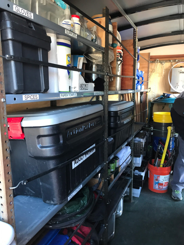 Troop gear goes on the left side. Labels indicate exactly what belongs: spices, paper towels, garbage bags and more.