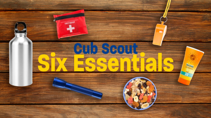 The Cub Scout Six Essentials, learned as part of the Wolf Rank, is a list of a half-dozen items every Cub Scout should carry when going on hikes or campouts.