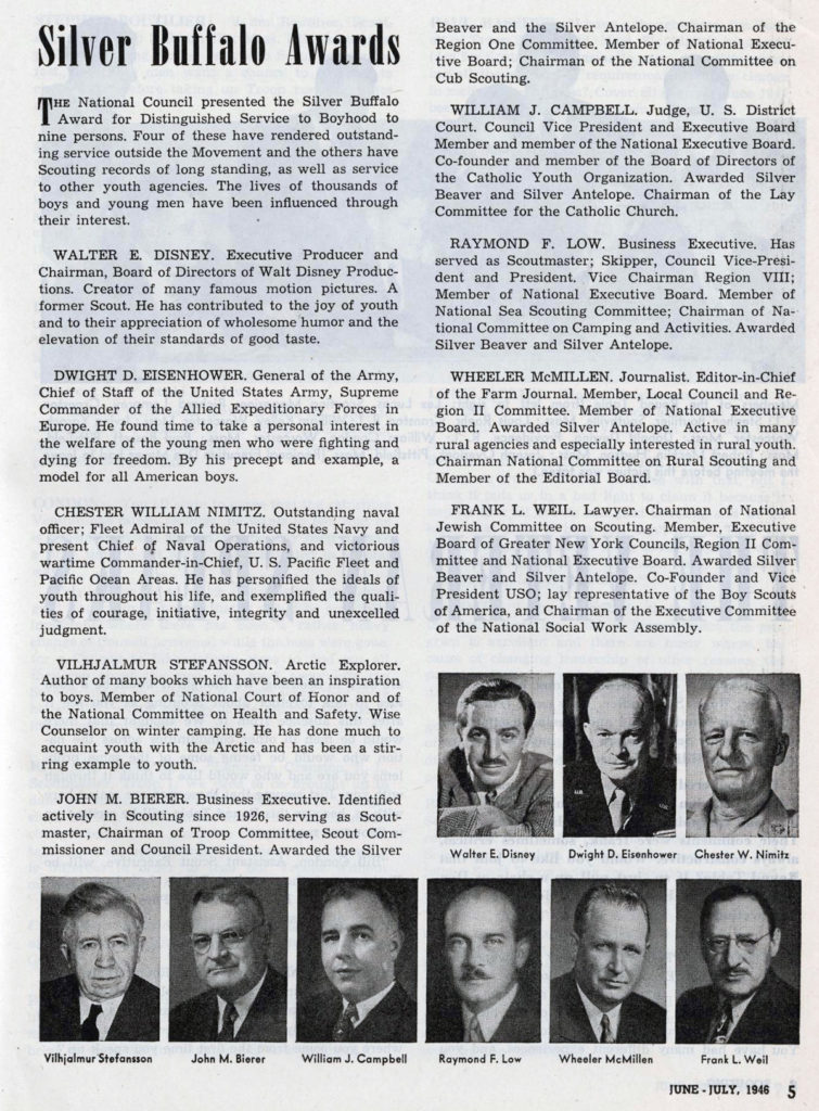 There we would’ve seen Walt Disney receive the Silver Buffalo Award. Disney’s fellow recipients that year were no slouches either. The list included Arctic explorer Vilhjalmur Stefansson, USO co-founder Frank Weil, and World War II veterans Dwight Eisenhower and Chester Nimitz.