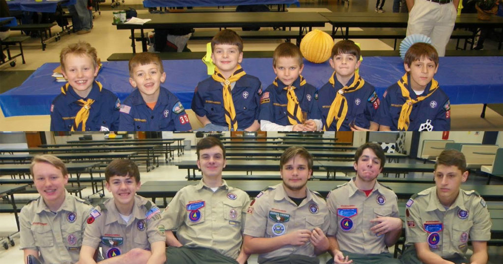 In 2007, six Wolf Scouts from Indiana sat at a cafeteria table and took a photo together. In 2017, those same six Scouts — by then all Eagles — gathered at the same table to remake that photo.