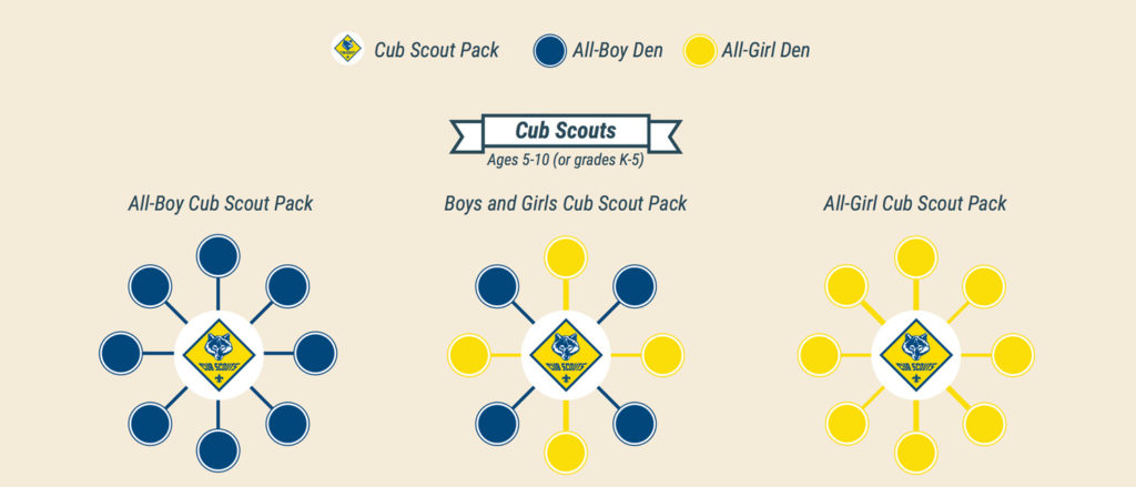 There will be three types of Cub Scout packs: all-boy packs, all-girl packs and packs that include a mix of girl dens and boy dens. Cub Scout dens will be single-gender: all boys or all girls.