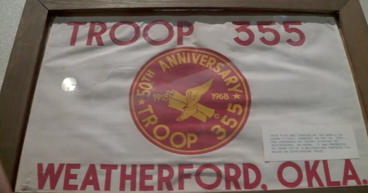 The flag honors Troop 355’s 50th anniversary, which it celebrated in 1968. After Stafford returned to Earth in 1969, he donated the flag to his old troop.