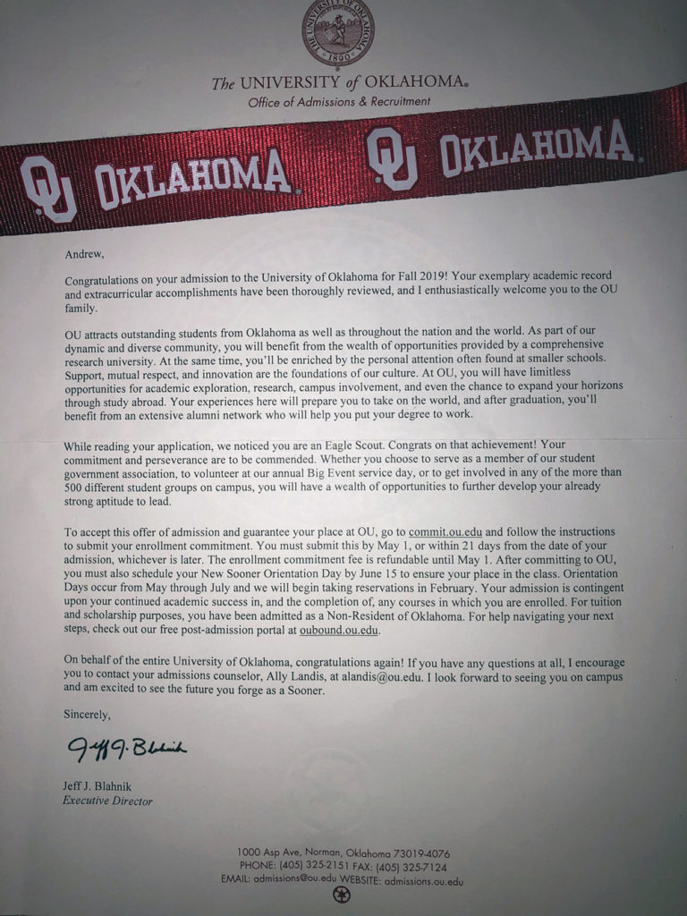 True, the letter from the highly regarded institution in Norman, Okla., doesn’t say that Andrew was accepted solely because he’s an Eagle Scout. His academic record, test scores and involvement in other extracurriculars were big factors, too.