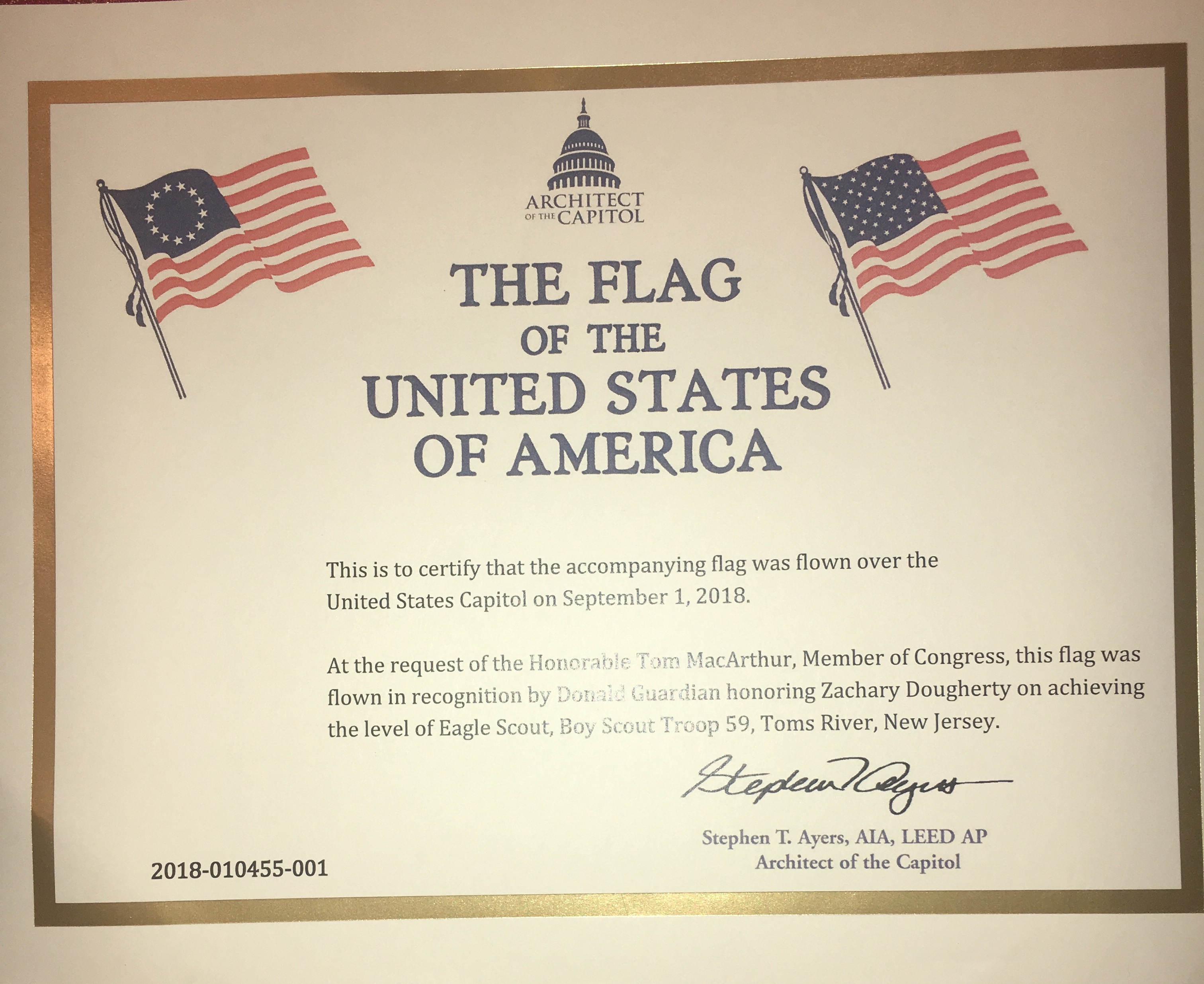 In September I had my Eagle Scout court of honor. My township business administrator (a former Scout executive and Mayor of Atlantic City) arranged for our congressman to send me a flag from the U.S Capitol.