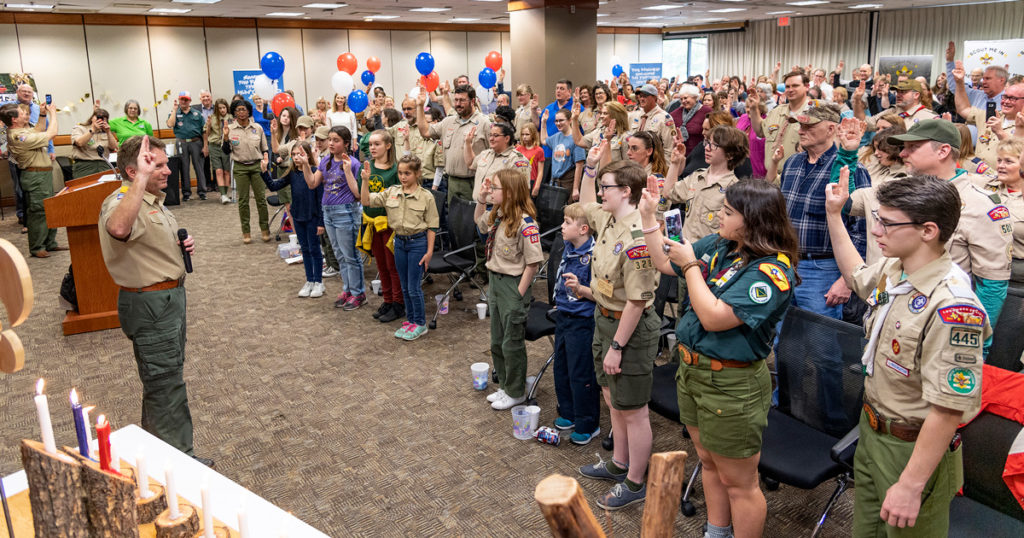 More than 25 girls, boys and their parents gathered at the BSA’s National Service Center in Irving, Texas, for a special celebration. They recited the Scout Oath and Scout Law, received their Scouts BSA Handbook, and met some of the men and women who have been working tirelessly over the past two years to prepare for the debut of Scouts BSA.