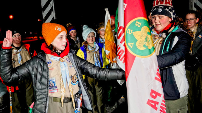 Here’s how it went down. In the waning hours of Jan. 31, the girls of Troop 82, joined by a couple of adult leaders, took a hike. They arrived at a covered bridge right at midnight. As they crossed the bridge, they were surprised to see a gathering of community leaders, family members and friends on the other side.