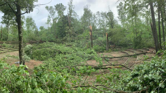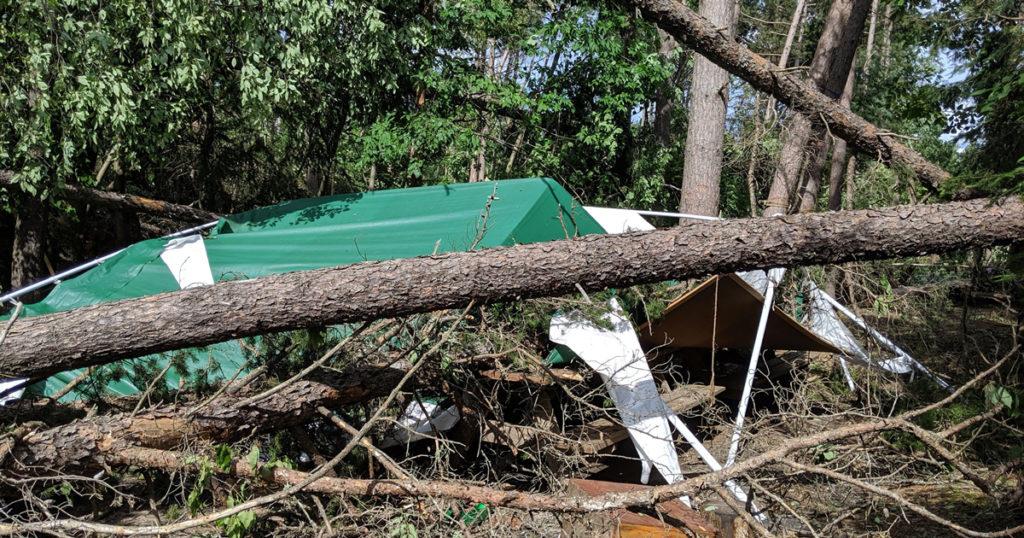 More than 350 Scouts, volunteers and staffers sheltered in the camp’s two dining halls as the storm raged outside. The macroburst produced wind gusts over 80 mph, sheared off trees, uprooted tents and sent branches crashing into buildings.