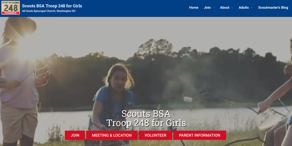 - A Scout-made utilitarian design that still looks good. The home page includes all the information visitors need at a glance — contact info, meeting time/location, calendar — alongside recent photos from troop events.