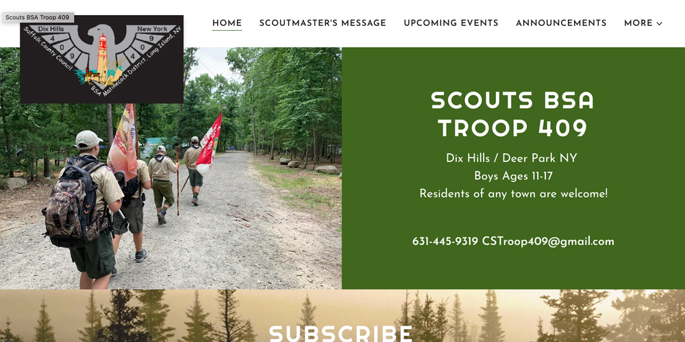 - A clean layout with a nice photo of Scouts hiking, contact info for the Scoutmaster and a note that “residents from any town are welcome.” Better yet, all that information is available “above the fold,” which in webspeak means visible before scrolling down.
