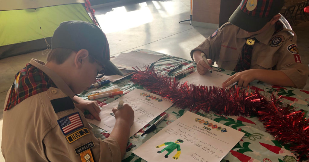 Each box also gets a handwritten letter from a Cub Scout, thanking the soldier for their service. Even though it may take a while, the pack usually gets a response.