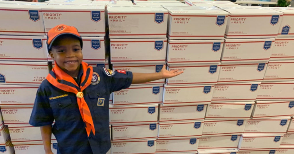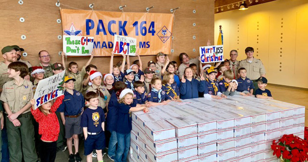 You don’t have to pack hundreds of boxes like Pack 164 to meet the requirements. Your den could work together to fill one box and send it overseas.