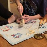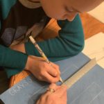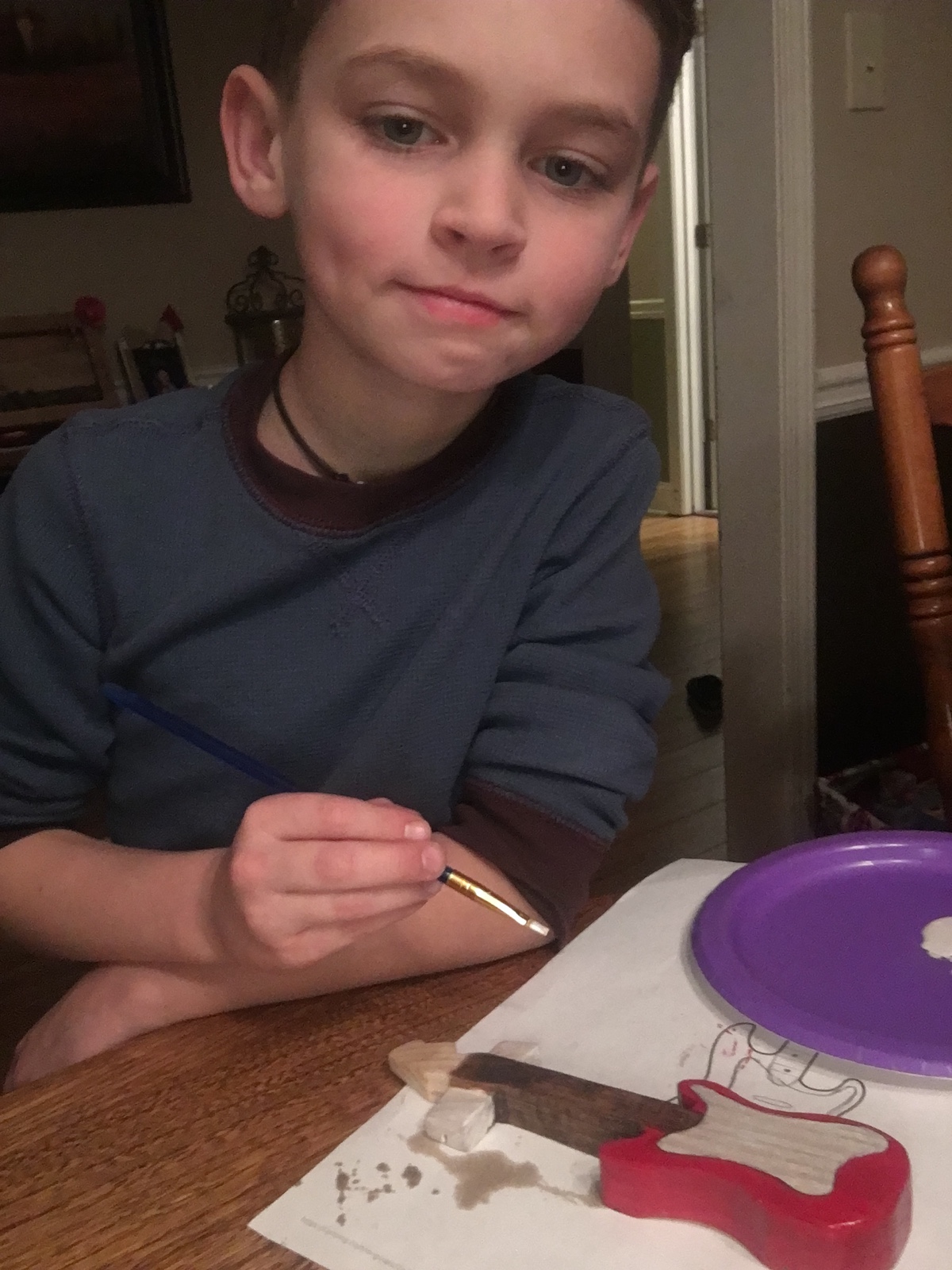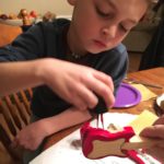 Grayson cut and made the guitar template, taped it to his block of wood and traced it out. His dad took the opportunity to teach him the details of guitars, what each part was, how it worked, etc. We took what we learned from building his Tiger car – what worked for him and what was hard for him to do – and made adjustments.