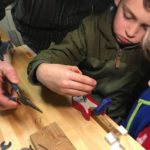 He earned his whittling chip so he wanted to incorporate that into the canoe build, while his father handled cuts with the bandsaw.
