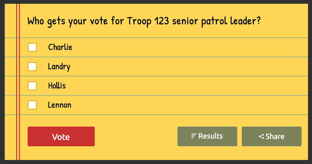 - Good: Free for up to 40 voters, customizable, simple setup, results can be hidden from troop if desired