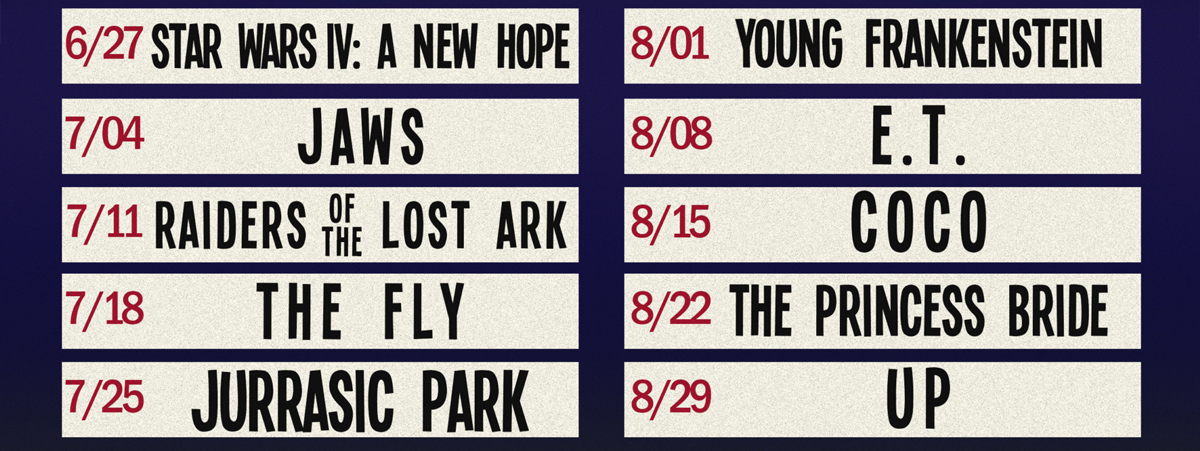 On 10 consecutive Saturdays this summer, the camp will show a mix of classic blockbusters and newer family favorites.
