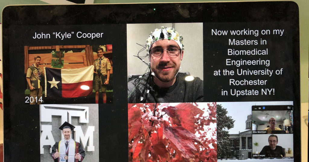 Troop 308 from Waco, Texas (Longhorn Council), invites past members to give a five-minute talk at the close of each week’s meeting. Because the meetings are being held through Zoom during the pandemic, it’s a snap to invite someone to join from anywhere in the world.