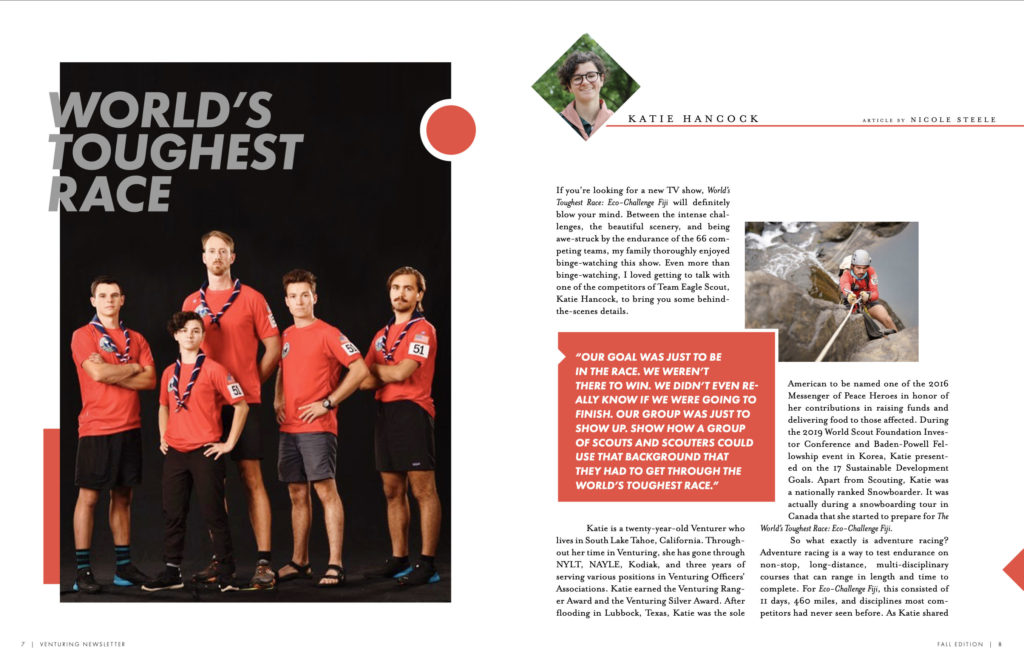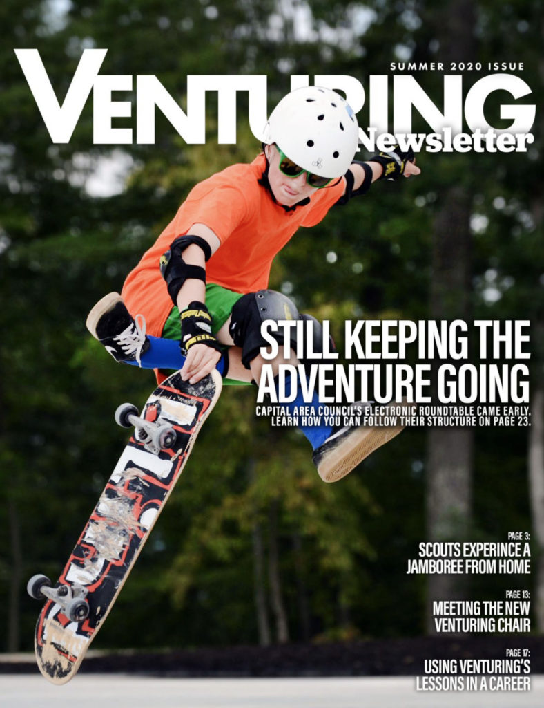 After exploring the Venturing Newsletter’s impressive design and inviting writing, I was surprised to learn that Nicole’s editorial team consists of just one other member: Jonathan Bergler, a Venturer in Crew 616, a high school senior and a self-taught graphic designer.