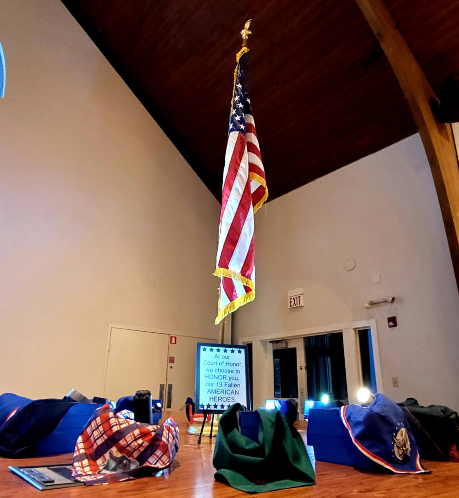 Several Troop 777 Scouts and parents helped set up the display, which included a sign that read, “At our court of honor, we choose to honor you, our 13 fallen American heroes.”