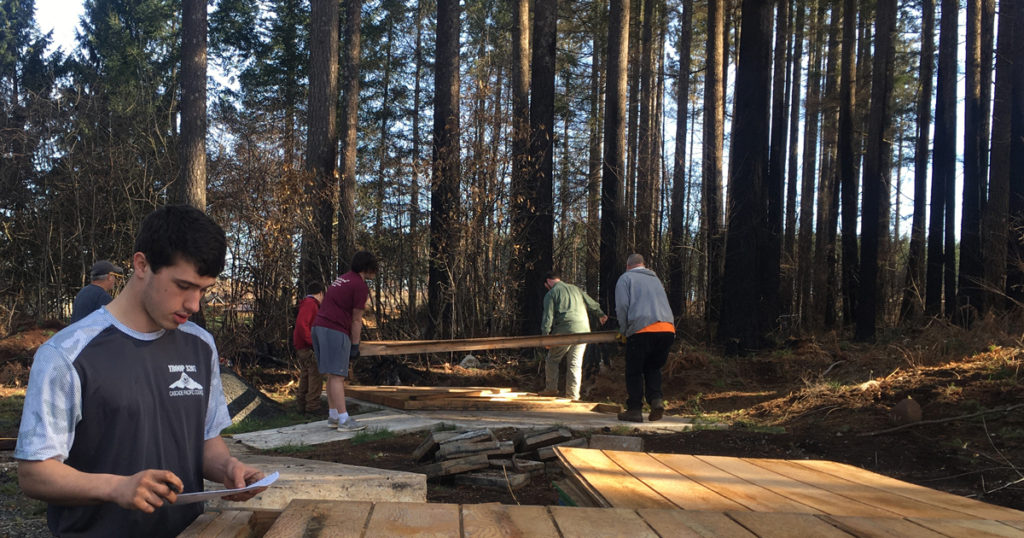 Before the wildfire, Jeremiah and his team of Scouts and adult volunteers had completed the first step of construction. They had mixed the cement and water for the concrete foundation. That concrete pad had cured and was ready to hold the shed’s weight.