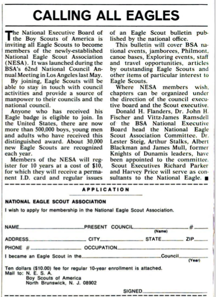 It took more than a year for it all to come together, but so it was that on May 19, 1972, the National Eagle Scout Association was officially born. Since then, NESA has continued to serve Eagle Scouts and, through them, the entire Scouting movement.