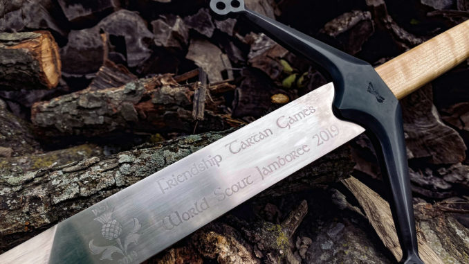So began a more than 2-year process to install a birch wood handle and etch the name on one side of the blade and details of the project on the other. The bladesmiths embedded a gold coin from the World Scout Jamboree in the handle. When it was finished, the sword measured 4 feet long and weighed more than 5 pounds.