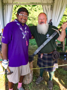 They went in 2013 — Bill on the staff, working at the Scottish Highland Games program area, and Taylor as part of his council’s contingent. Afterward, the staff and Bill began brainstorming how to improve that program area for the next Jamboree. Since he had decades of blacksmithing expertise, he thought about introducing a Scottish Highland arms and armament element.