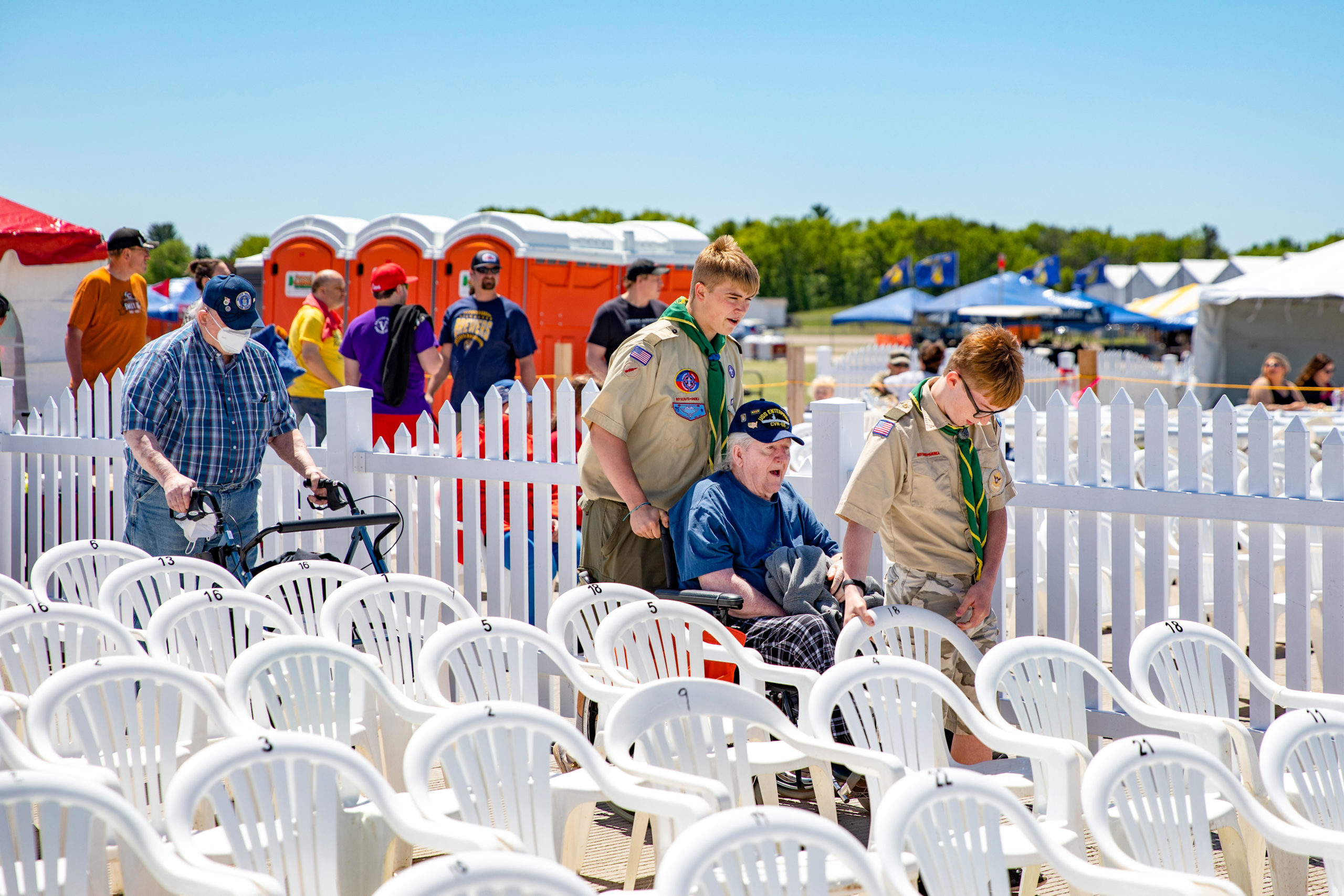 In a small town on the East Coast, a Scouts BSA troop volunteers at a big community event, helping people find seating, performing a flag ceremony and collecting donations for the local food bank.