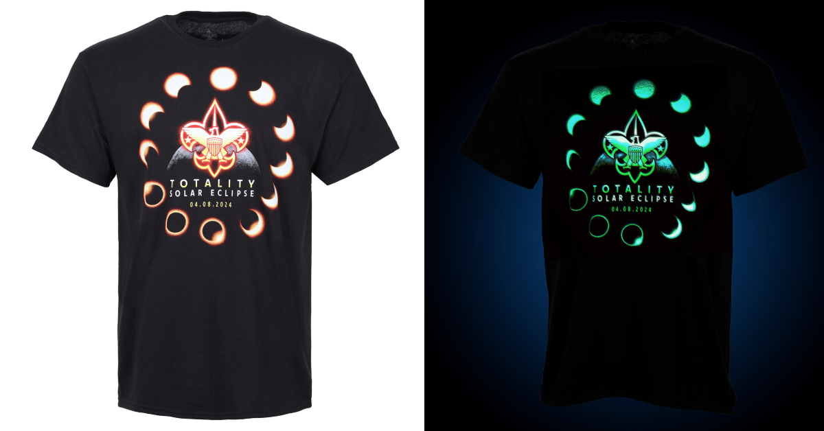 • Venturers and Sea Scouts: Research Sir Arthur Stanley Eddington’s 1919 experiment and discuss how it confirmed Einstein’s theory of general relativity. - Ask your unit leader to purchase the BSA Total Solar Eclipse 2024 Emblem! Scout Shop is also offering a glow-in-the-dark patch set and a nifty looking glow-in-the-dark T-shirt, if you really want to go all out. (How cool would it be if a group of Scouts all wore that glow-in-the-dark shirt at a public viewing event in their community?!?)