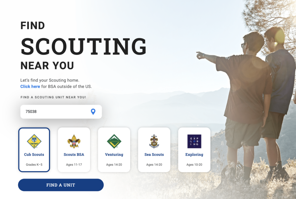 Good news: There is! It’s BeAScout.org. Families can enter their ZIP codes and find Cub Scout, Scouts BSA, Venturing and Sea Scout units near them. (Scouting America’s Exploring program has its own site that allows you to find posts and clubs near you.)