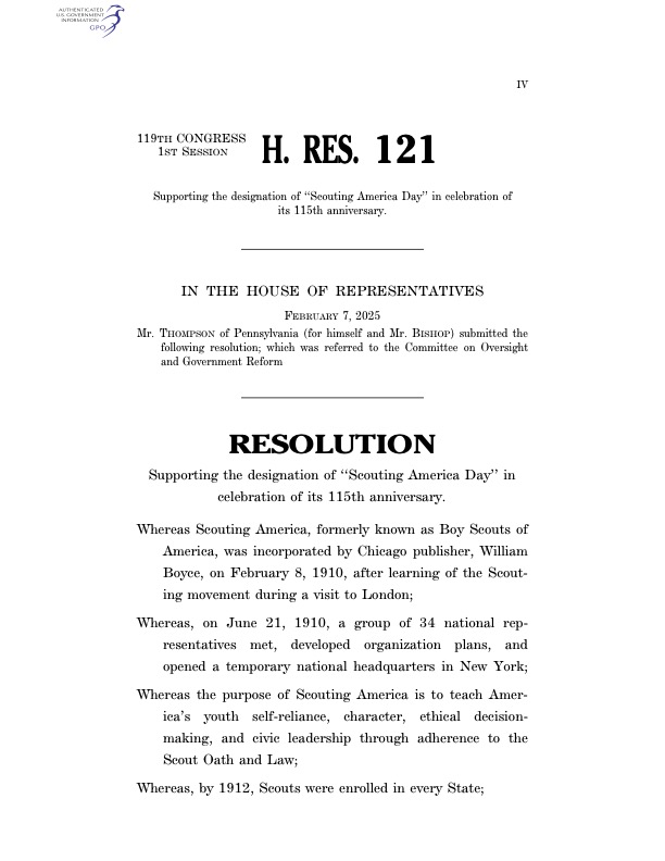 Adding to the celebration, two members of the U.S. House of Representatives introduced a Congressional resolution recognizing the 115th anniversary of Scouting America. The resolution was introduced by Glenn “GT” Thompson (R-Pa.) and Sanford D. Bishop, Jr. (D-Ga.), co-chairs of the bipartisan Congressional Scouting Caucus.