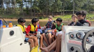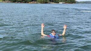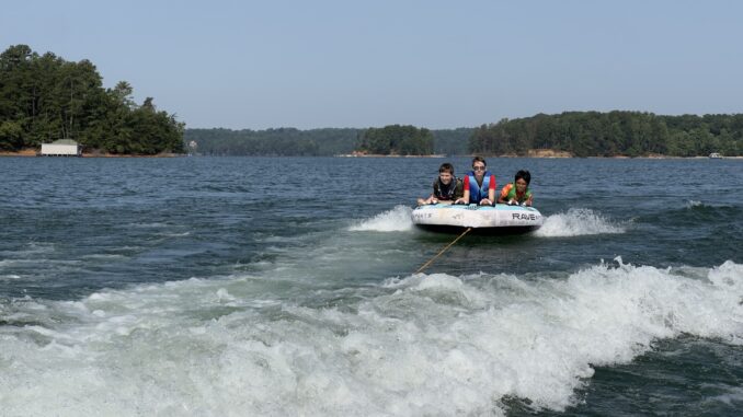 Three Scouts grip onto a large towable tube. A motorboat steadily pulls them across the lake. It’s a lot of fun, but when water from the boat’s wake splashes them as the boat gently turns, that’s when the real excitement begins.