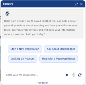 When you access Scoutly from the scouting.org home page, you get the message, “Hello I am Scoutly, an AI-based chatbot that can help answer general questions about Scouting and help you with common tasks. We value your privacy and will keep your information secure. How can I help you today?”