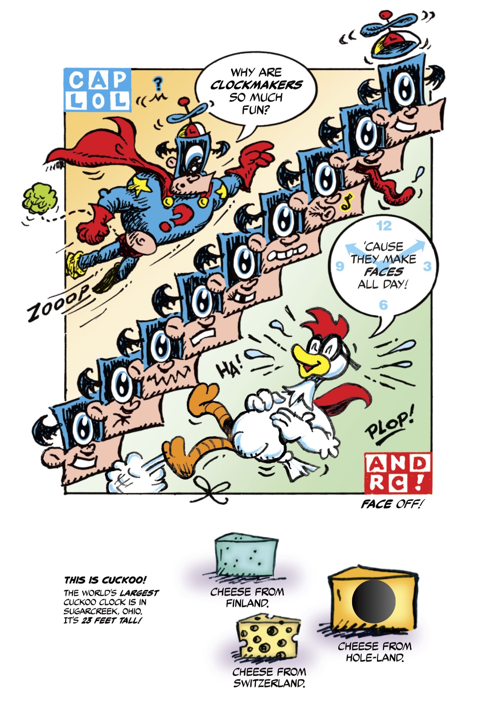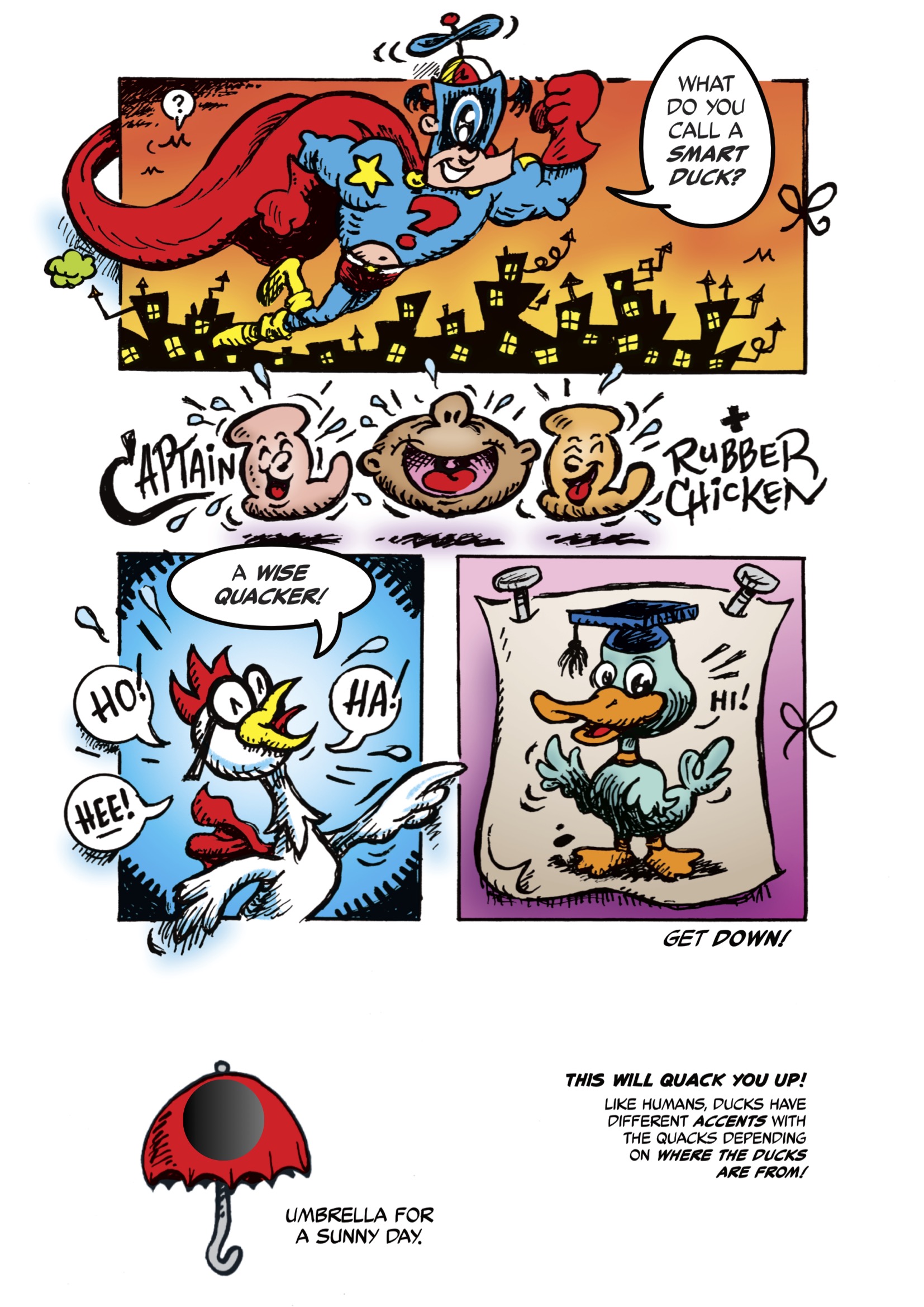 Now, if you have a second, I’d like to tell you about my newest publishing project, the book Captain LOL + Rubber Chicken: HAR HAR! It’s dad jokes and funny superhero stories in comics form. It really is just a mashup of the old Boys’ Life comics section and “Think and Grin.”